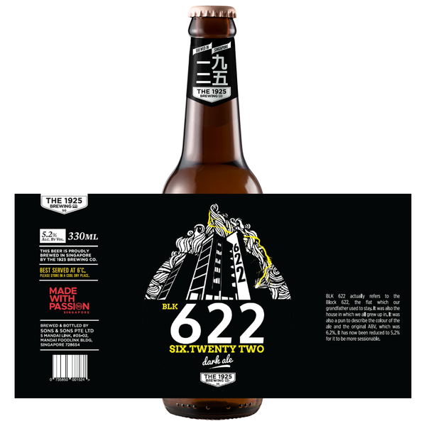 BLK622 (5.2% ABV) actually refers to the Block 622, the flat which our grandfather used to stay. It was also the house in which we all grew up in. The body is jet black with a smooth creamy foam head. Flavours are bold and rich, with hints of dark chocolate, coffee and caramel.